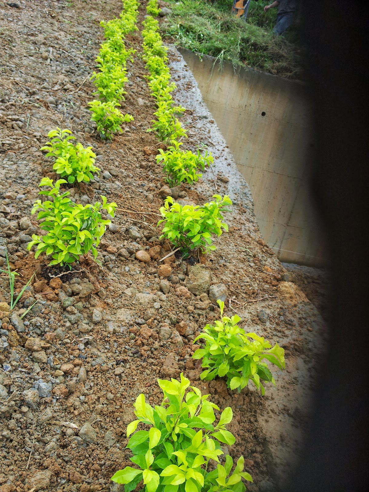 農園邊因不想用磚造或鐵絲圍牆,想要種植樹木來當圍牆,與老公選擇金露花來當綠籬,趁颱風連續下雨,趕緊種植綠籬兼檔土,金露花其枝葉茂密,生長力強,成排種植作為綠籬,可兼收美觀與防衛之效。