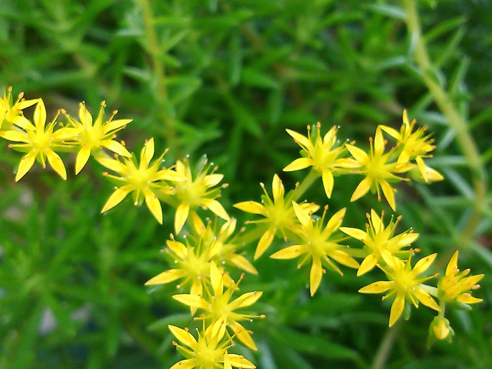 三月初,松葉景天的花梗已經悄悄的探出頭來了。每一枝花梗像一把傘般敞開來,而朵朵小花都如小星星般一一排列著,非常可愛。