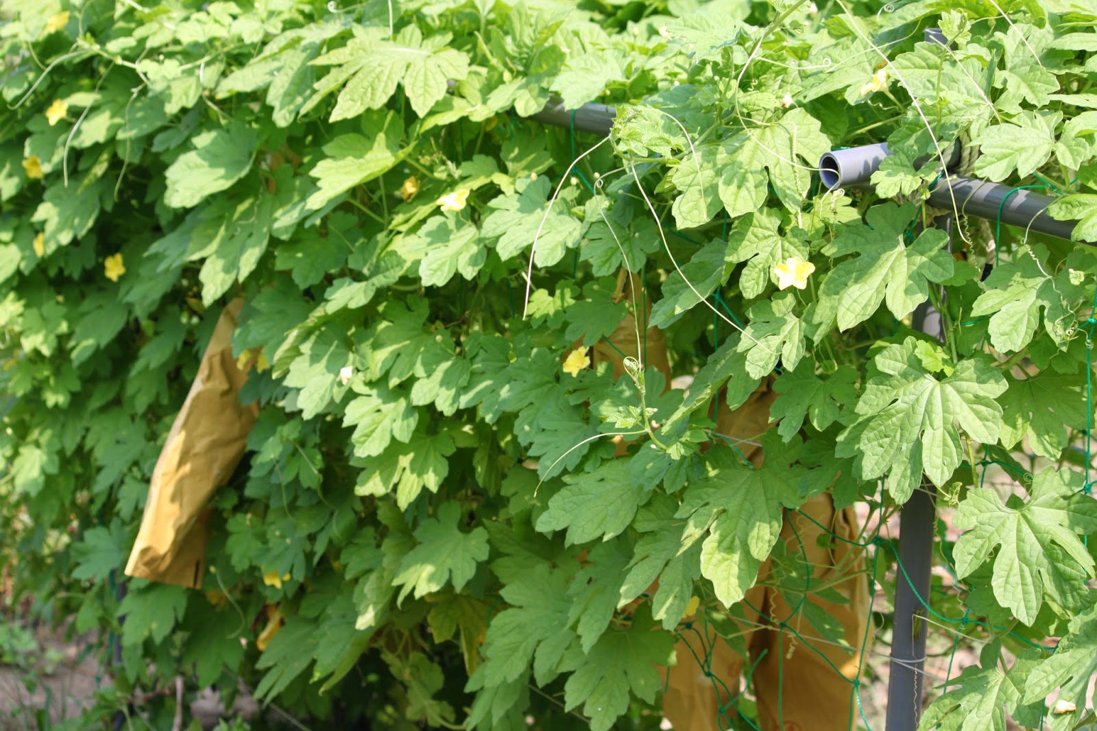 每次到菜園巡視,總會見到一、二顆小苦瓜垂掛枝蔓,當然立即包上套袋來保護它們,七月盛夏是菜園苦瓜盛產的季節,從套上套袋後約二星期即可採收,所以來菜園必檢視苦瓜生長情形。